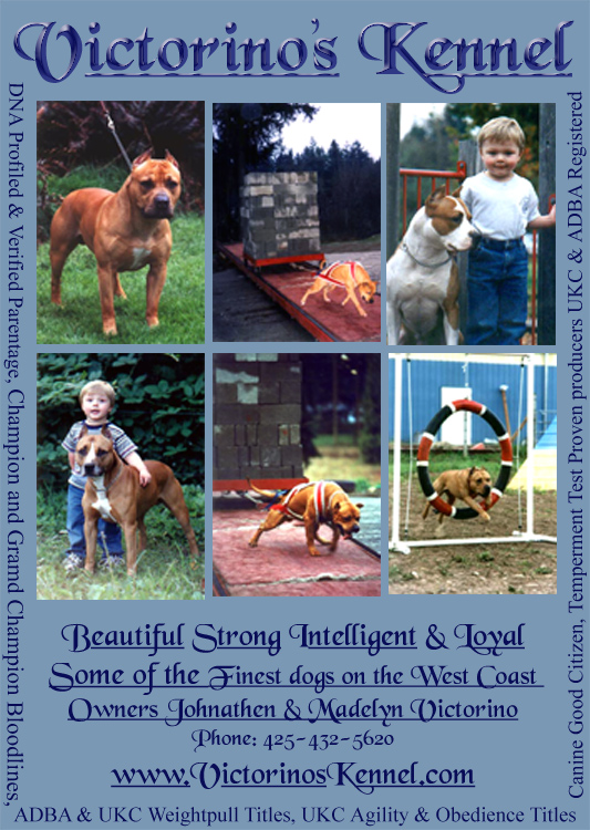 Welcome to Victorino's Kennel main page, here you can go to the scroll bar to your left of the screen and check out many pages of dogs. We love and own the American Pit Bull Terrier, we are responsible owners / breeders and place our puppy's into quality homes. We care about the outcome of the breed we chose to own. It is not about how many APBT's you produce with show titles next to their name. It's not about how many dogs you can place your Kennel name on. It is about what Happens to that dog/puppy after it leaves your yard.